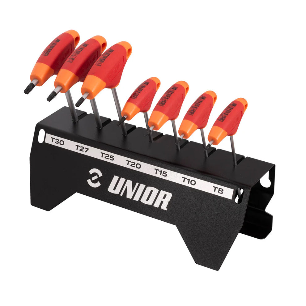 This set includes a range of sizes: TX8, TX10, TX15, TX20, TX25, TX27, TX30 and the additional handy holder, making sure you always have the right tool for the job at hand. Crafted with precision, each wrench boasts a chrome-plated chrome-vanadium shank coupled with a comfortable two-component handle for an ergonomic and secure grip. To elevate the precision of these tools, the tips are meticulously coated with black oxide, optimizing tool tolerances for the utmost accuracy in your tasks.Our TX T-wrenches are designed to provide a flawless fit for fasteners and bolts, giving you unwavering confidence in your tasks. The two-component handle ensures a comfortable and secure grip, making each use a pleasure. You'll find yourself reaching for these top-notch TX wrenches time and time again.The T-handle holder is entirely made of metal and designed to fit your TX T-handle wrenches perfectly. It will look great holding your daily used T-handles on top of the bench or mounted on our bench/wall panels.