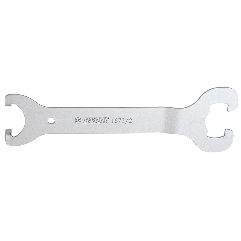 The wrench is 2.5mm thick and 204mm long. One end features a pin spanner with a distance of 27.3mm between pins. The other end has a wrench on it that fits the 16.5mm x 31mm bosses found on some adjustable cups.