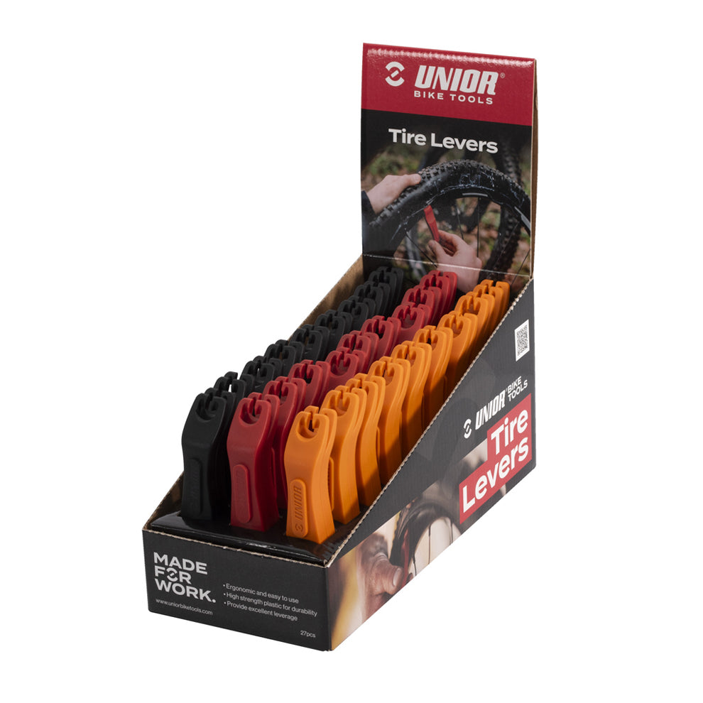 Our high-quality tire levers are now available in an attractive countertop display box, perfect for putting next to your checkout for those last minute add-on sales. The box includes 27 pairs of levers, 9 pairs each in red, green, and black. Bulk refill bags are available for when these start to run low.