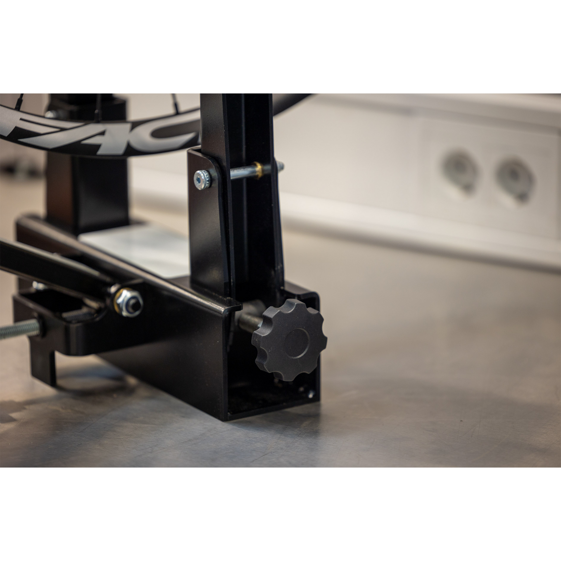 - Comes with conical magnetic through axle adapters – one size fits all (12, 15 and 20). The adapters are now magnetic and can be affixed anywhere on the base. Features a bolt for more permanent fix on the upright arms.