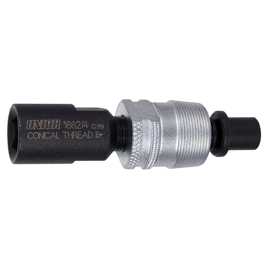 Our Unior 1662/4 Square Tapered Crank Puller offers a feature that other pullers don't: like the taper on the bottom bracket spindle, the threads that engage the crank have a taper as well. This taper helps the tool to engage damaged threads on the crank arm, making removal of otherwise nightmarish cranks easy.